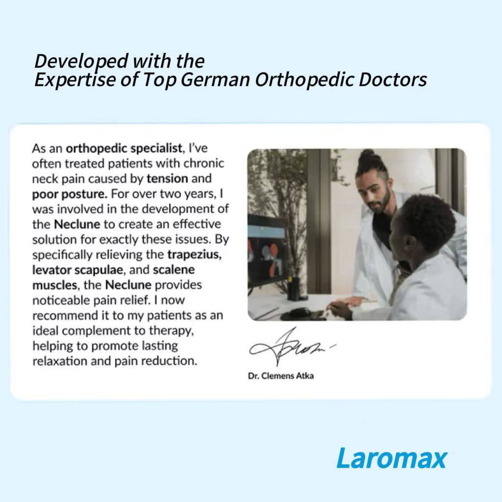 The Laromax Massager is professionally designed and endorsed by chiropractors and physical therapists as an affordable alternative for neck pain relief.